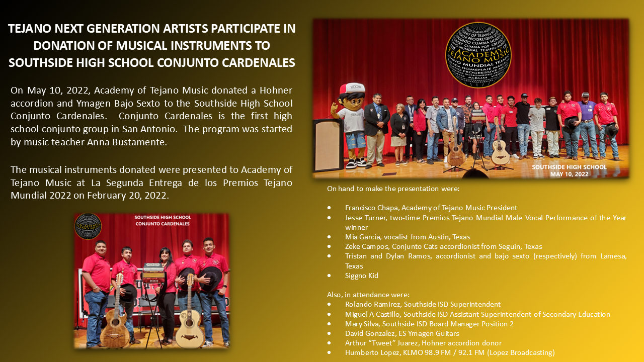 Academy of Tejano Music, a 501c (3) non-profit organization, shall advance artistic and technical excellence, work to ensure a vital and free creative environment, and act as advocate on behalf of Tejano music and its makers. This shall be accomplished through programs and activities that engage the music industry and the cultural community as well as the general public. Attention will be brought to important issues such as the value and impact of music on arts education and the urgency of preserving the rich Tejano cultural heritage.